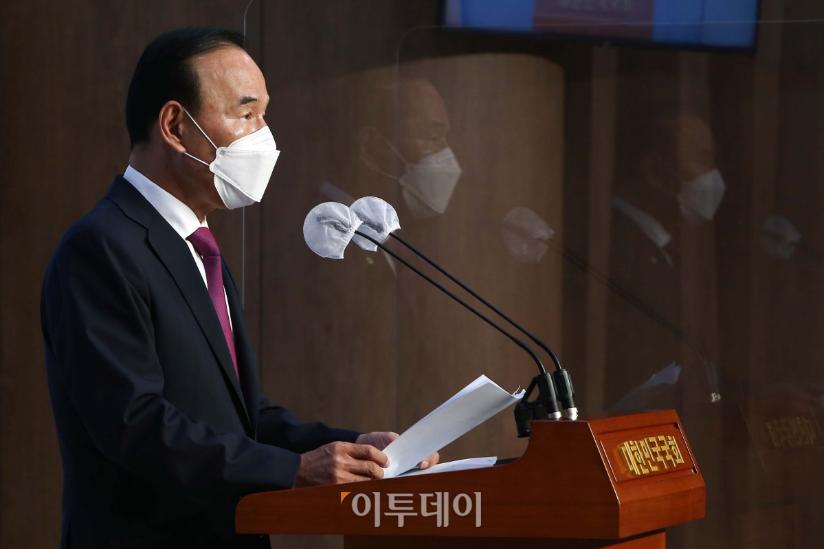 가족 기업이 피감기관으로부터 수천억원대 특혜 수주를 받았다는 의혹을 받고 있는 박덕흠 국민의힘 의원이 23일 국회 소통관에서 탈당 기자회견을 하고 있다.