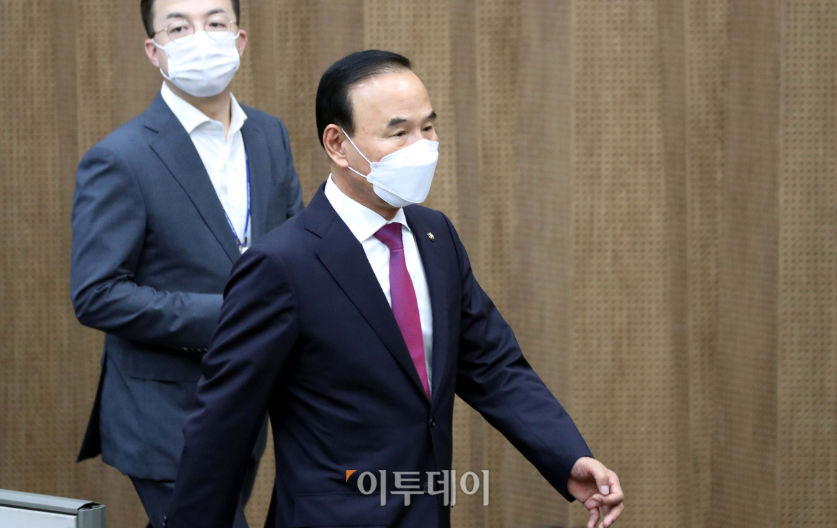 가족 기업이 피감기관으로부터 수천억원대 특혜 수주를 받았다는 의혹을 받고 있는 박덕흠 국민의힘 의원이 23일 국회 소통관에서 탈당 기자회견을 마친 뒤 나서고 있다.