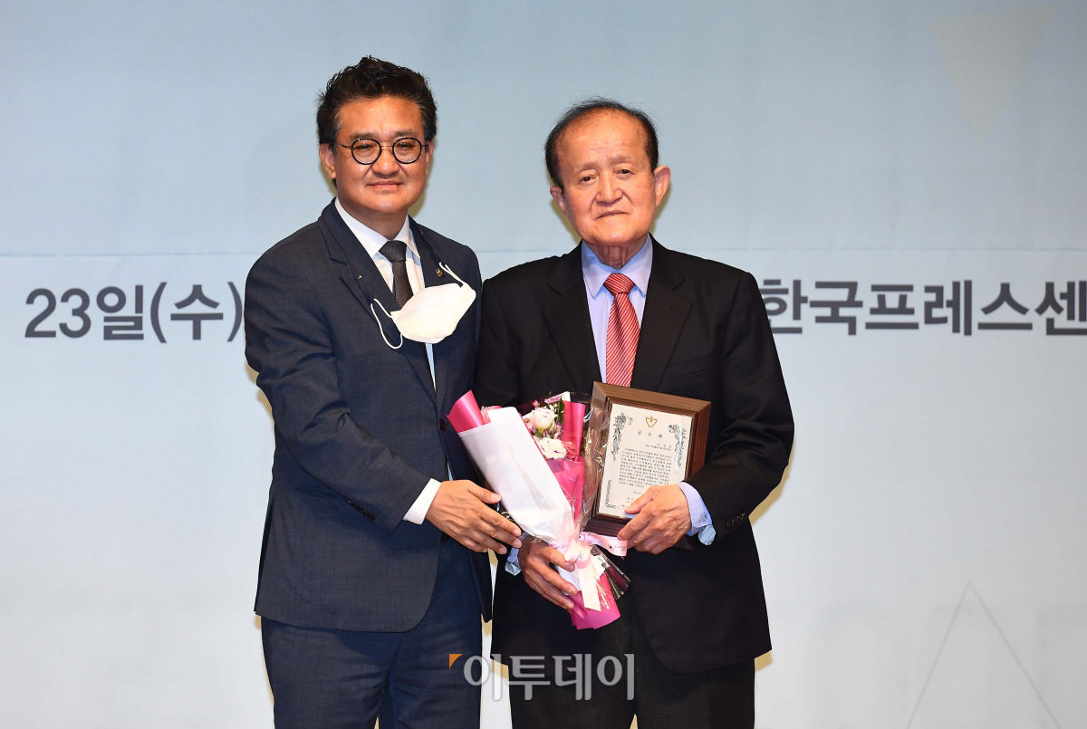 김동훈 한국기자협회 회장이 23일 서울 중구 프레스센터에서 열린 ‘기자협회보 지령 2000호 기념식’에서 이성춘 14대 기자협회장에게 공로패를 수여한 뒤 기념촬영을 하고 있다.