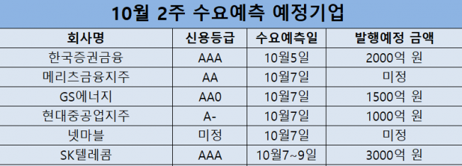 25일 크레딧업계에 따르면 10월 2주에는 제일 먼저 한국증권금융이 수요예측에 나선다. 한국증권금융(AAA)은 5년물과 10년물로 2000억 원 규모의 회사채 발행을 위한 수요예측을 진행한다. 대표주관사는 KB증권이다. 조달금액은 10월 만기가 도래하는 1500억 원 규모 회사채 차환에 사용될 에정이다. 크레딧 업계는 한국증권금융이 탄탄한 영업기반과 재무건전성 등으로 ‘AAA’ 등급을 보유하고 있는 만큼, 수요예측에서 충분한 수요를 확보할 수 있을 것으로 보고있다.