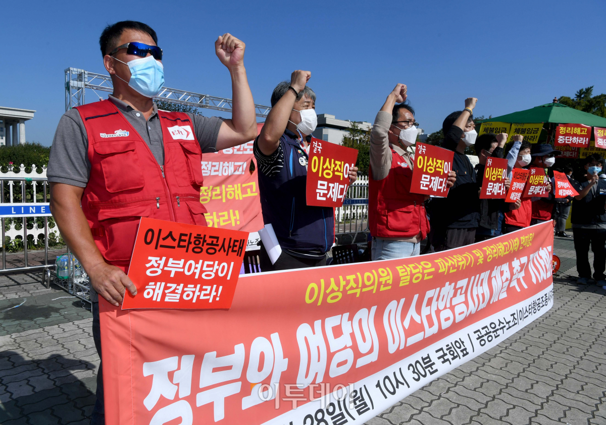 28일 서울 여의도 국회 앞에서 민주노총 공공운수노조 이스타항공조종사노조 관계자들이 기자회견을 갖고 정부와 여당이 이스타항공사태를 해결해 줄 것을 촉구하며 구호를 외치고 있다.
