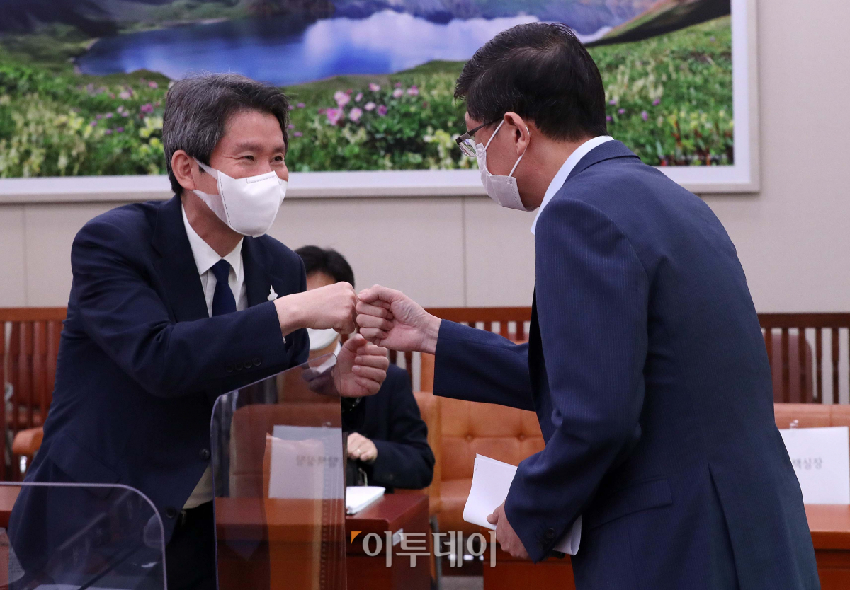 이인영 통일부 장관(왼쪽)과 김홍걸 무소속 의원이 28일 서울 여의도 국회에서 열린 외교통일위원회 전체회의에 참석해 주먹인사를 나누고 있다.
