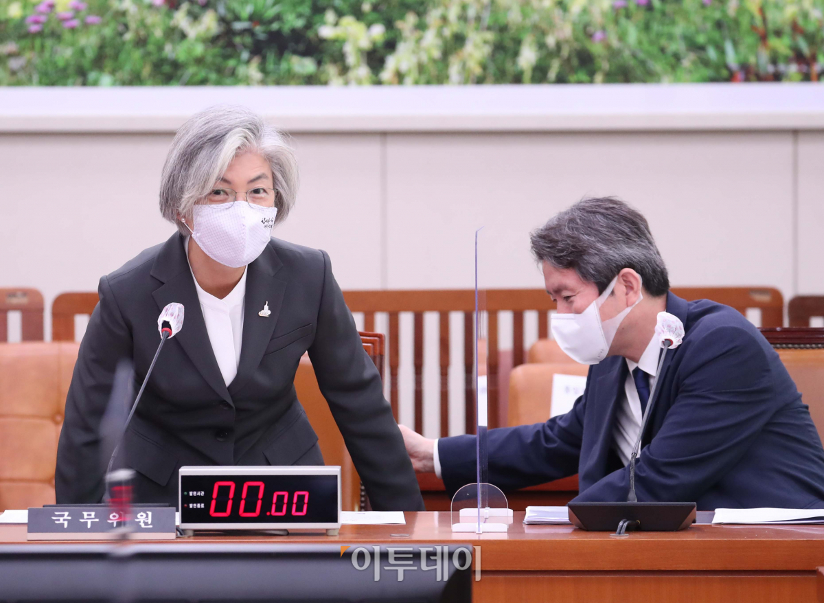 강경화 외교부 장관과 이인영 통일부 장관이 28일 오전 서울 여의도 국회에서 열린 외교통일위원회 전체회의에 참석하고 있다.
