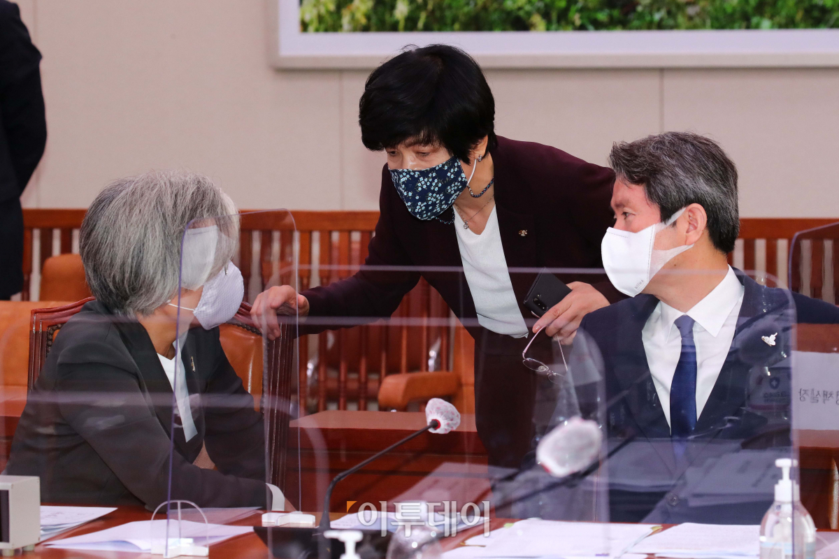 28일 오전 국회에서 열린 외교통일위원회 전체회의에서 강경화 외교부 장관, 더불어민주당 김영주 의원, 이인영 통일부 장관이 대화하고 있다.