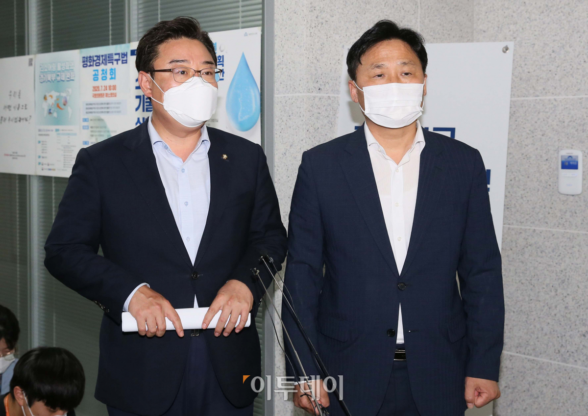 김영진 더불어민주당 원내수석부대표와 김성원 국민의힘 원내수석부대표가 28일 오후 서울 여의도 국회의원회관에서 여야 원내수석 회동을 마치고 브리핑하고 있다.