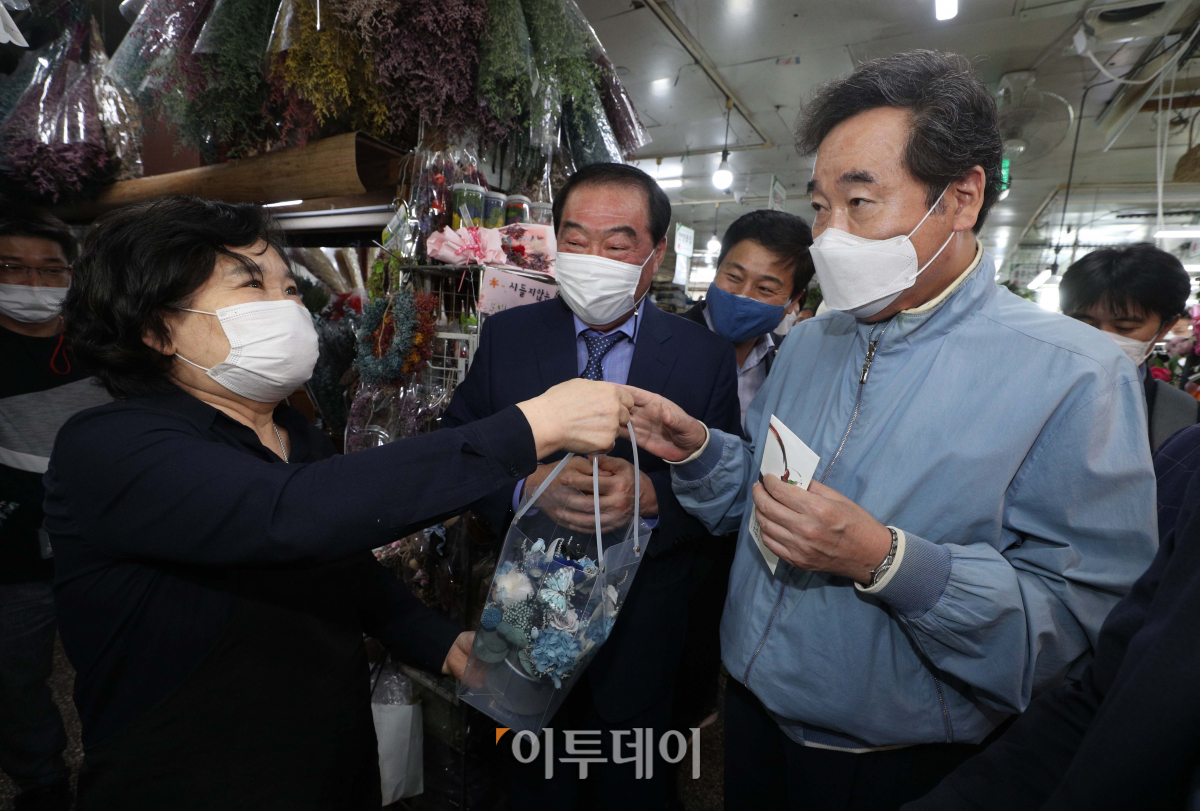 이낙연 더불어민주당 대표가 추석 연휴를 앞둔 29일 오전 서울 중구 남대문시장을 방문해 꽃시장 상인에게 꽃다발을 선물을 받고 있다.