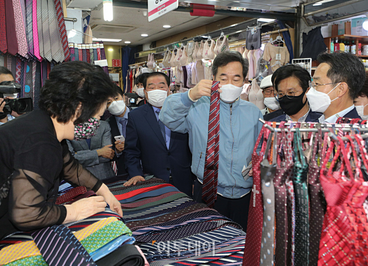 이낙연 더불어민주당 대표가 추석 연휴를 앞둔 29일 오전 서울 중구 남대문시장을 방문해 넥타이를 구매하고 있다.