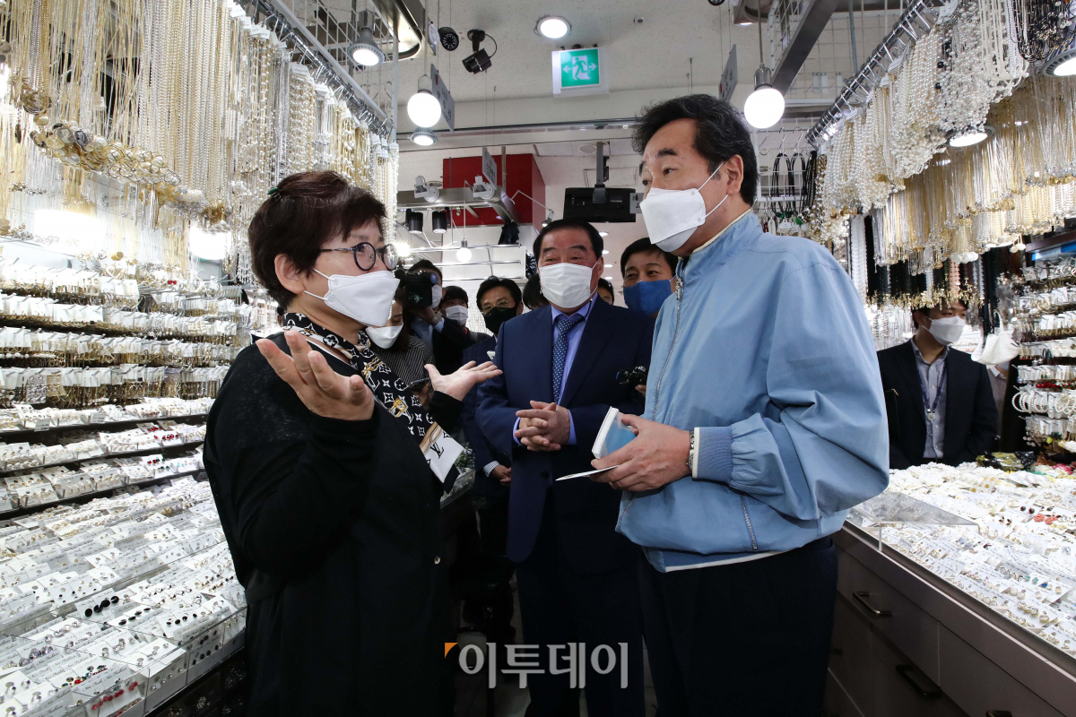 추석 연휴를 하루 앞둔 29일 서울 중구 남대문시장을 찾은 더불어민주당 이낙연 대표가 상인들과 대화하고 있다.