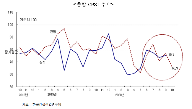 건산연은 이달 CBSI가 65.9로 9월보다 9.4P 떨어질 것으로 예상했다. 예년 같았으면 10월에도 공사 물량 증가 효과가 이어지지만 올해는 오히려 경기가 악화될 게 우려되는 상황이다. 연구진은 건설기업들이 특히 대금 수금이나 자금 조달 등에서 어려움을 많이 겪을 것으로 분석했다.