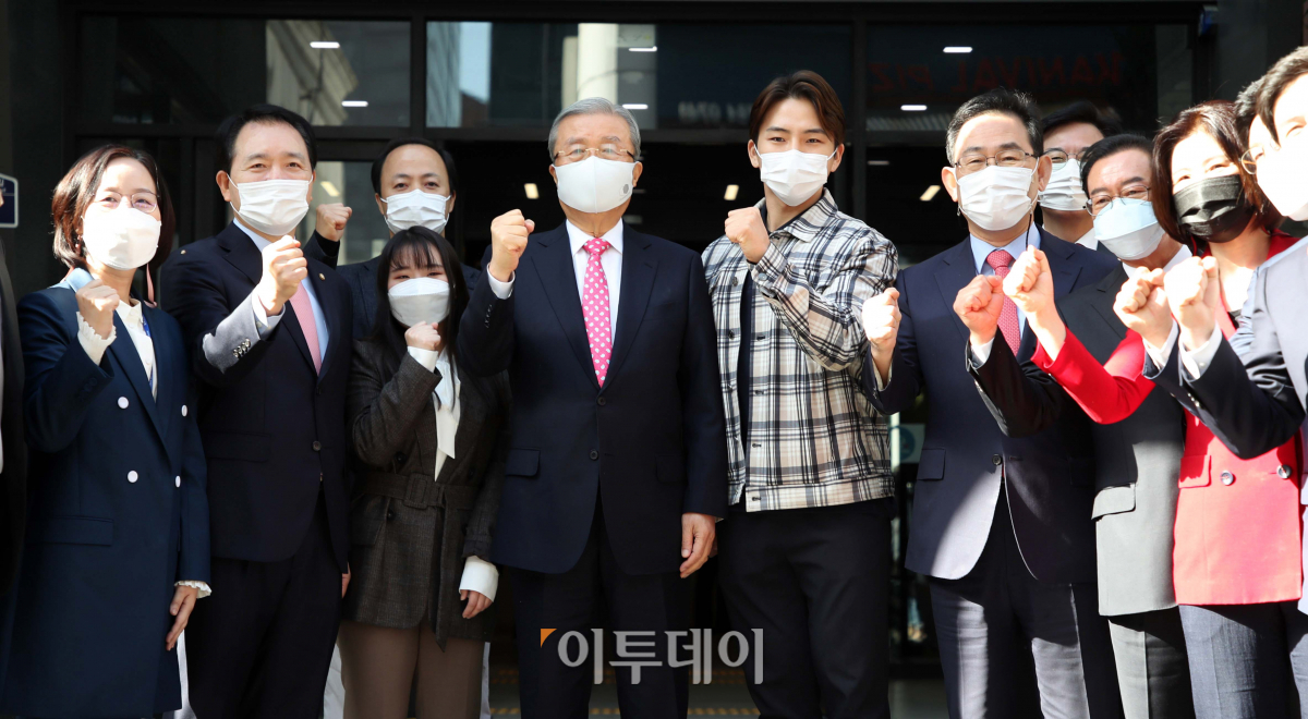 김종인 국민의힘 비상대책위원장과 주호영 원내대표 등 당 지도부가 5일 오후 서울 여의도 남중빌딩에 위치한 새 당사에서 현판식을 하고 있다.