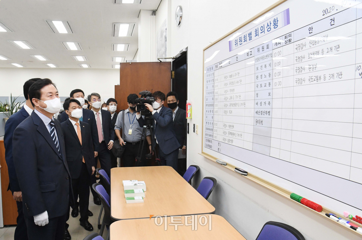 김영춘 국회사무총장(왼쪽 첫번째) 전상수 입법차장등 관계자들이 5일 오전 여의도 국회에서 '2020년도 국정감사 종합상황실 ' 현판식 후 상황판을 둘러보고 있다.