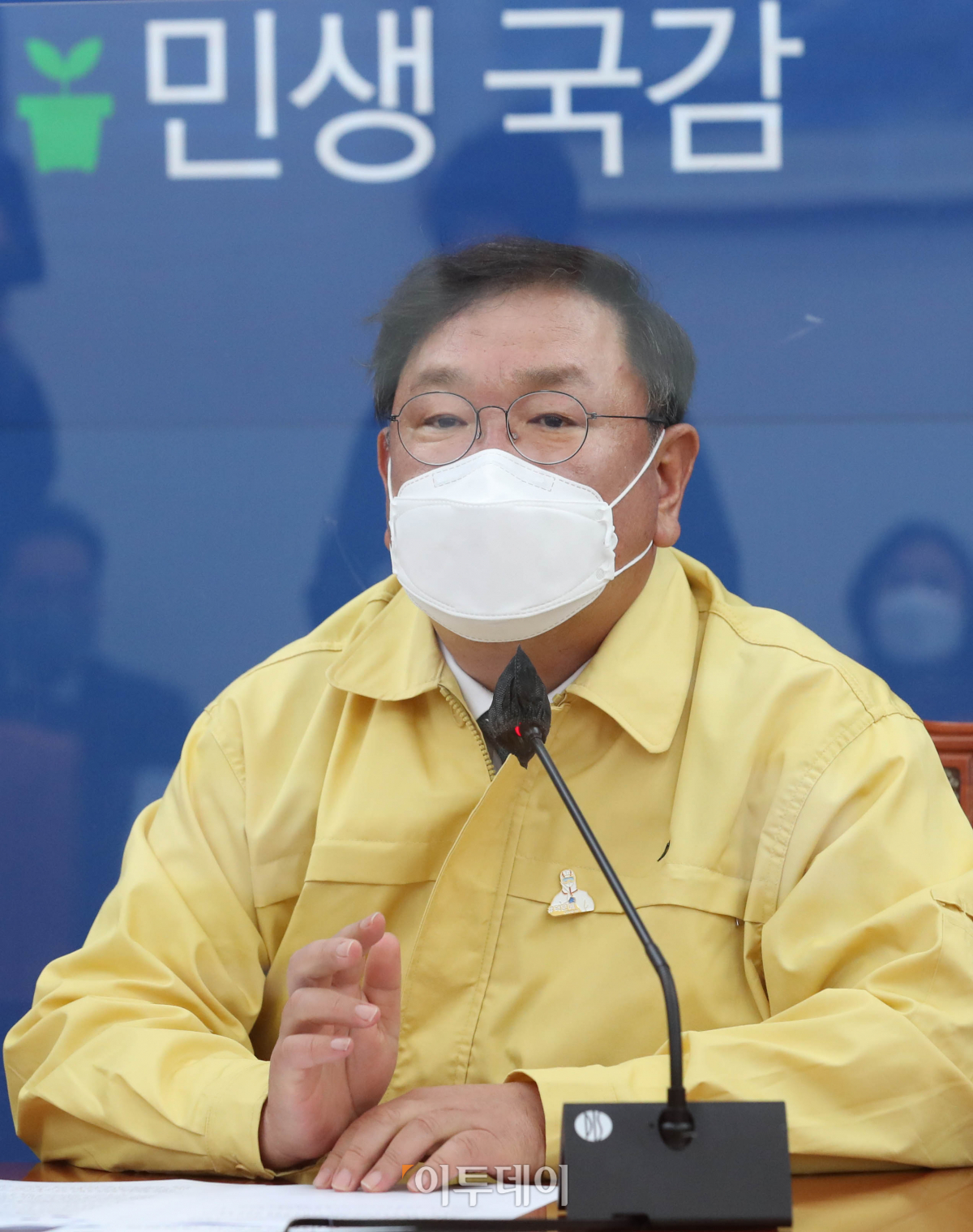 김태년 더불어민주당 원내대표가 6일 서울 여의도 국회에서 열린 더불어민주당 국정감사 대책회의에서 모두발언을 하고 있다.