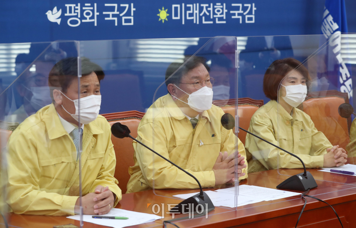김태년 더불어민주당 원내대표가 6일 서울 여의도 국회에서 열린 더불어민주당 국정감사 대책회의에서 모두발언을 하고 있다.