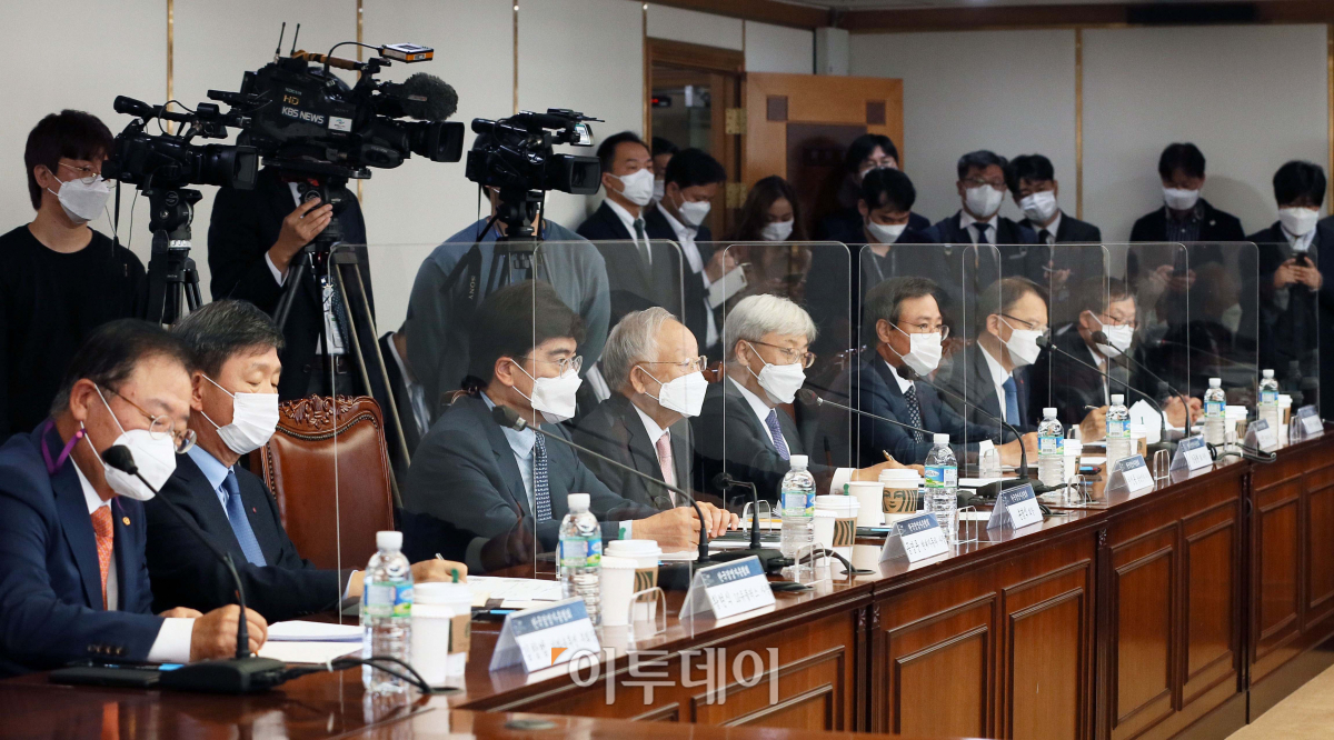 6일 오전 서울 마포구 경총회관에서 열린 이낙연 더불어민주당 대표와의 경총 간담회에서 손경식 한국경영자총협회 회장을 비롯한 6대그룹 사장단이 이낙연 더불어민주당 대표의 인사말을 듣고 있다. 이날 간담회엔 이낙연 더불어민주당 대표, 김진표, 양향자 의원과 손경식 경총 회장, 김용근 상근부회장, 이인용 부회장 삼성전자 사장, 공영운 현대자동차 사장, 장동현 SK 사장, 황현식 LG유플러스 사장, 오성엽 롯데지주 사장, 김창범 한화솔루션 부회장이 참석했다.