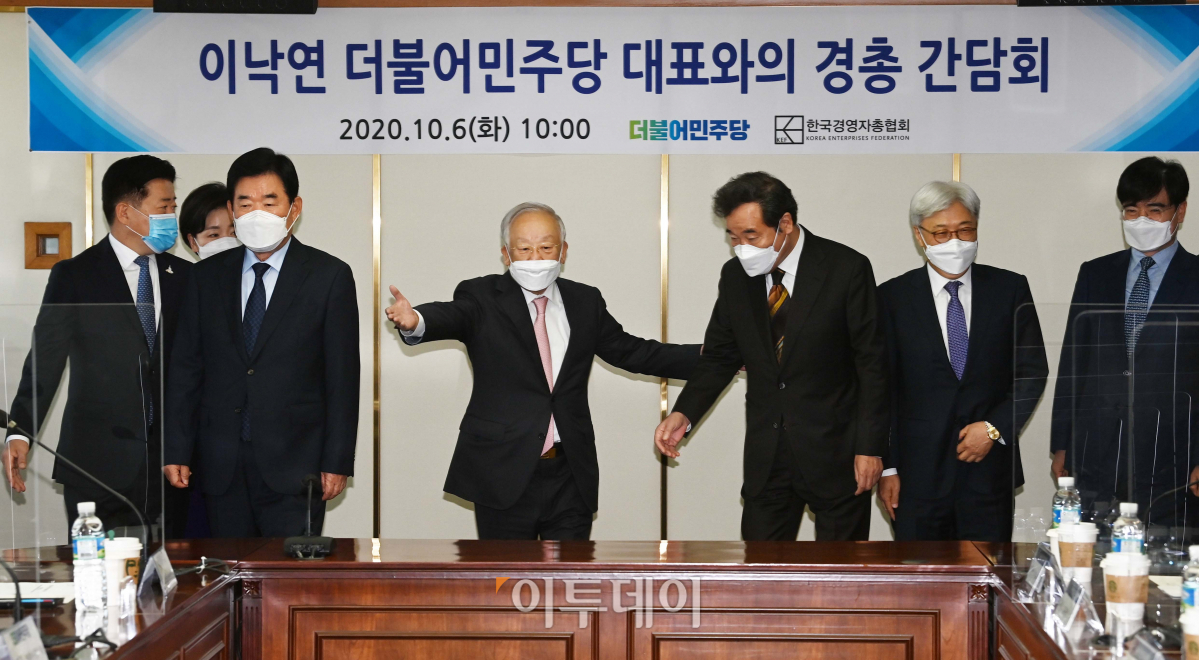 더불어민주당 이낙연(오른쪽 세번째) 대표가 6일 오전 서울 마포구 백범로 한국경영자총협회에서 열린 간담회에서 손경식 경총 회장의 안내를 받고 있다. 이날 간담회엔 이낙연 더불어민주당 대표, 김진표, 양향자 의원과 손경식 경총 회장, 김용근 상근부회장, 이인용 부회장 삼성전자 사장, 공영운 현대자동차 사장, 장동현 SK 사장, 황현식 LG유플러스 사장, 오성엽 롯데지주 사장, 김창범 한화솔루션 부회장이 참석했다.