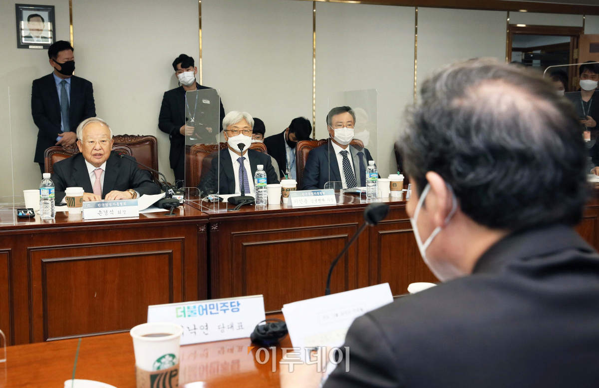 손경식 한국경영자총협회 회장이 6일 오전 서울 마포구 경총회관에서 열린 이낙연 더불어민주당 대표와의 경총 간담회에서 인사말을 하고 있다. 이날 간담회엔 이낙연 더불어민주당 대표, 김진표, 양향자 의원과 손경식 경총 회장, 김용근 상근부회장, 이인용 부회장 삼성전자 사장, 공영운 현대자동차 사장, 장동현 SK 사장, 황현식 LG유플러스 사장, 오성엽 롯데지주 사장, 김창범 한화솔루션 부회장이 참석했다.