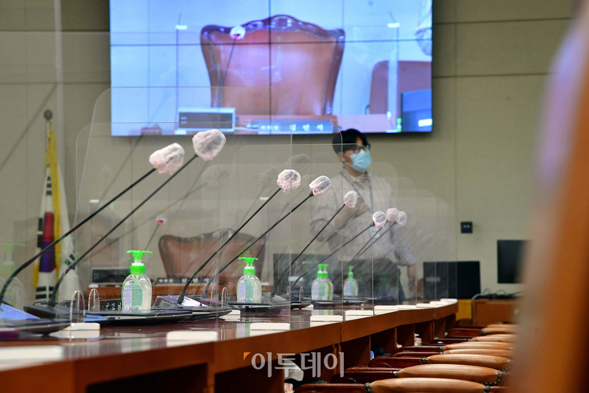 초유의 신종 코로나바이러스 감염증(코로나19) 사태 속에 21대 국회 첫 국정감사가 하루 앞으로 다가왔다. 이번 국감장에는 마이크를 기존 2인 1개에서 1인 1개로 늘렸고, 좌석마다 칸막이를 설치했다. 6일 오후 서울 여의도 국회 보건복지위원회 회의실이 방역에 집중한 회의 준비로 분주하다.