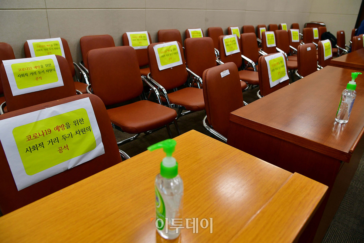 초유의 신종 코로나바이러스 감염증(코로나19) 사태 속에 21대 국회 첫 국정감사가 하루 앞으로 다가왔다. 이번 국감장에는 마이크를 기존 2인 1개에서 1인 1개로 늘렸고, 좌석마다 칸막이를 설치했다. 6일 오후 서울 여의도 국회 보건복지위원회 회의실이 방역에 집중한 회의 준비로 분주하다.