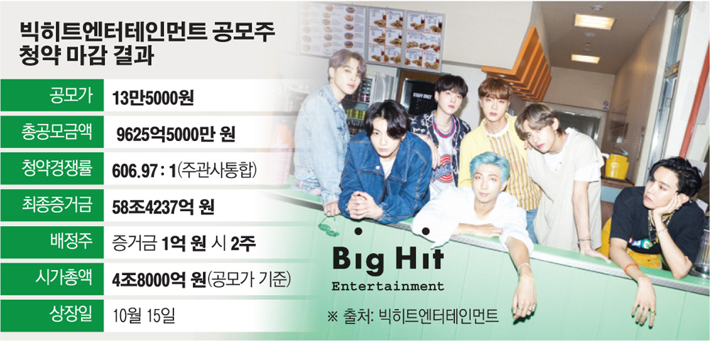 이틀간의 일반 청약을 마무리한 빅히트는 오는 15일 코스피에 상장한다. 공모가는 13만5000원, 공모가 기준 시가총액은 약 4조8000억 원이다.
