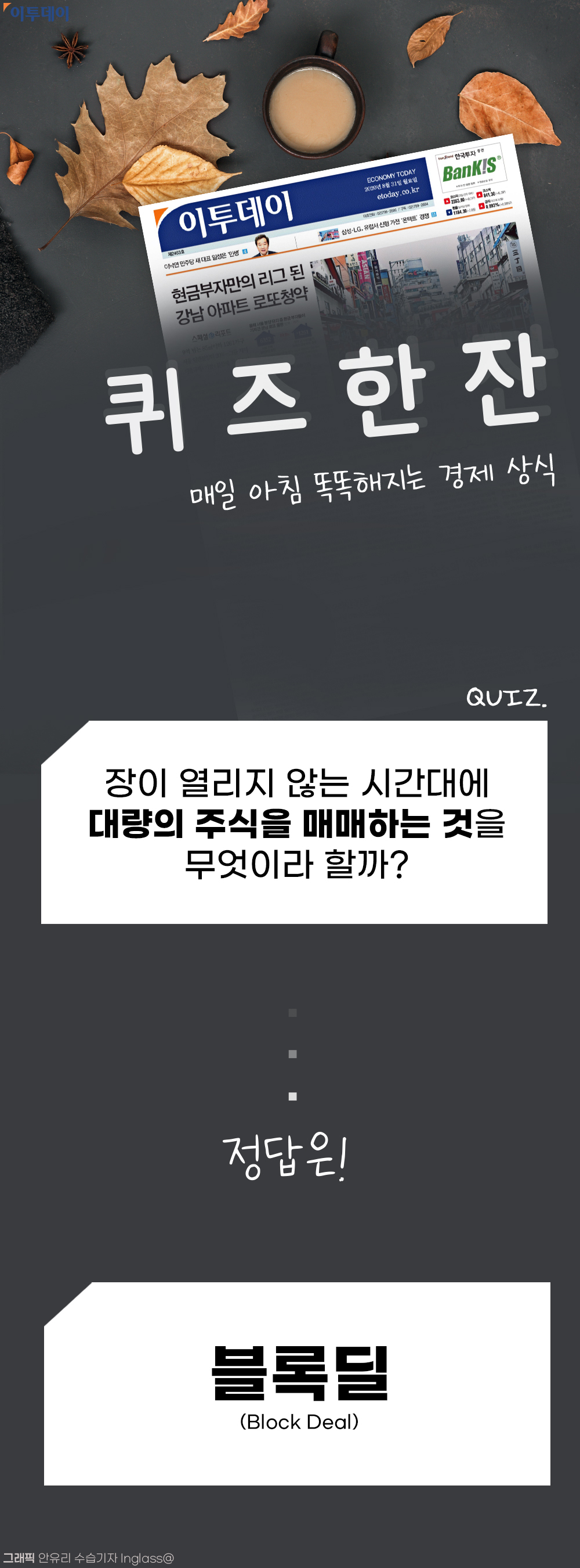 ‘퀴즈한잔’은 매일 한 문제씩 이투데이와 함께하는 경제 상식 퀴즈입니다! 매일 아침 커피 한 잔을 마시듯 퀴즈를 풀며 경제 상식을 키워나가세요!