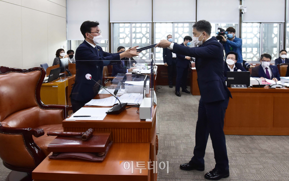 박능후 보건복지부장관(오른쪽)이 7일 서울 여의도 국회 본관 보건복지위원회의실에서 열린 보건복지부-질병관리청 등 2020 국정감사에서 김민석 국회 보건복지위원장에게 선서문을 전달하고 있다.