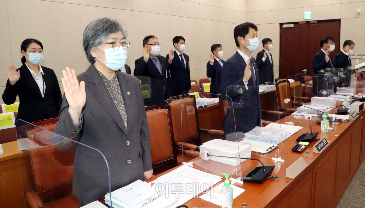 정은경 질병관리청장이 7일 오전 국회에서 열린 보건복지위 국정감사에서 선서를 하고 있다.
