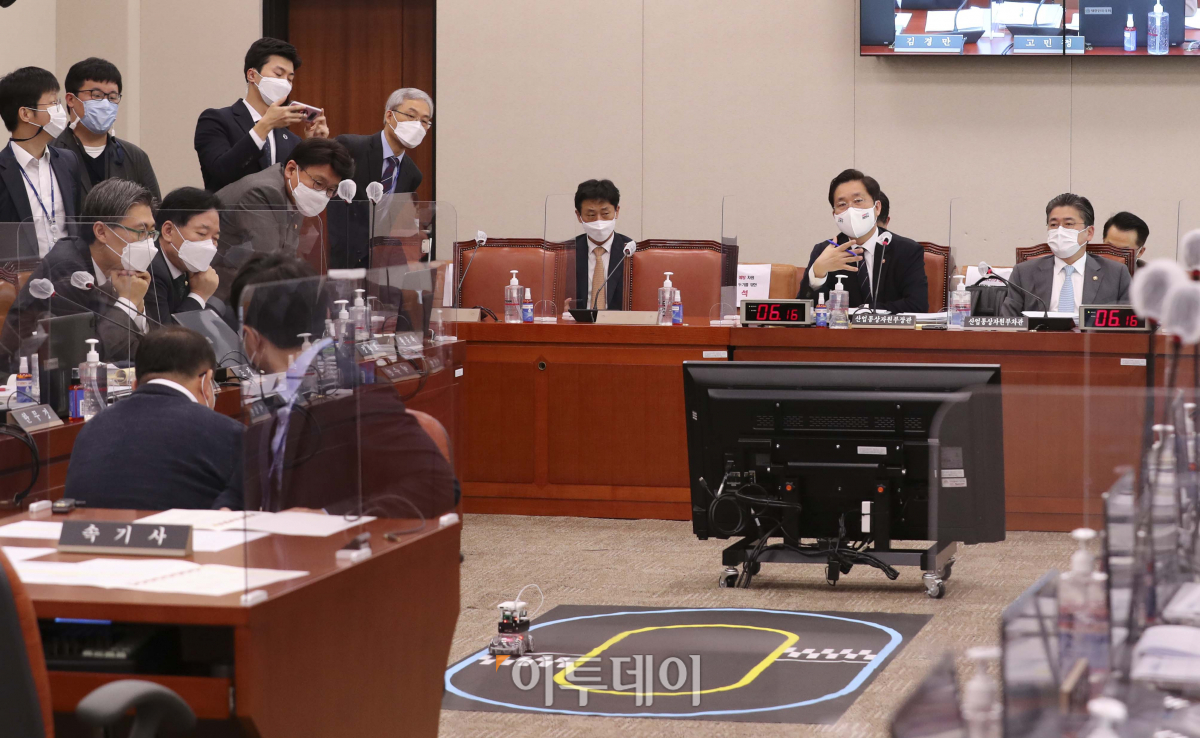 성윤모 산업통상자원부 장관(오른쪽 둘째)가 7일 오전 서울 여의도 국회 산업통상자원중소벤처기업위원회 전체회의실에서 열린 산업통상자원부 국정감사에서 고민정 민주당 의원이 준비한 자율주행 로봇에 대해 답하고 있다.