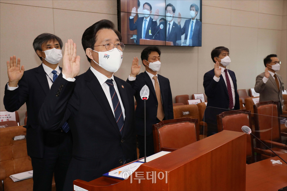성윤모 산업통상자원부 장관이 7일 오전 서울 여의도 국회에서 열린 국회 산업통상자원중소벤처기업위원회의 산업통상자원부에 대한 2020년 국정감사에서 선서를 하고 있다.