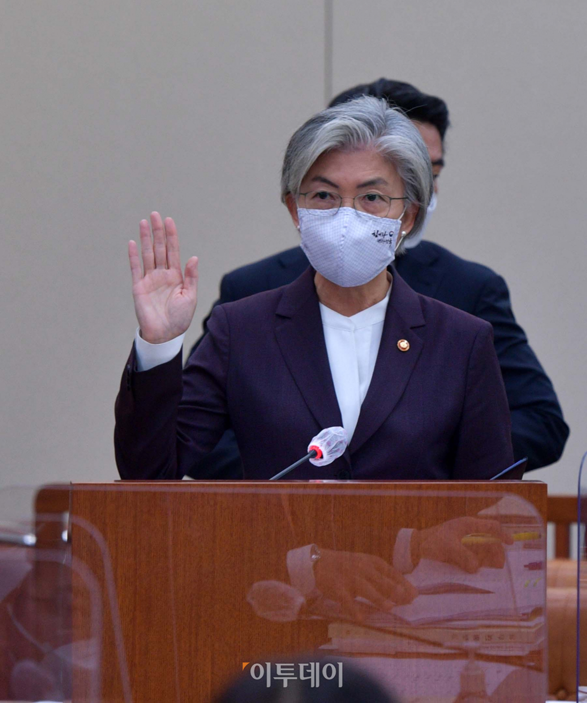 강경화 외교부 장관이 7일 국회에서 열린 외교통일위원회의에 외교부에 대한 국정감사에 출석, 증인선서를 하고 있다.