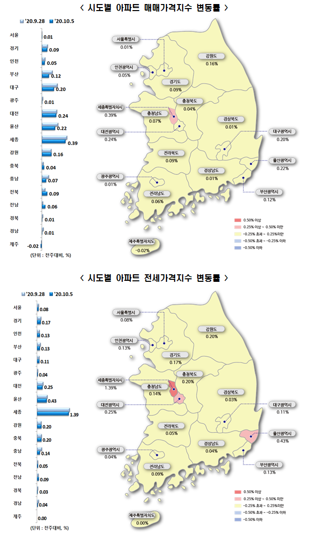 지방 광역시와 세종에서도 아파트값 상승률이 다소 떨어지긴 했지만 전국 평균을 웃돌았다. 수도 이전론으로 집값이 고공행진하고 있는 세종은 아파트 매매 가격이 전주보다 0.39% 올랐다. 대전과 울산에서도 정비사업장 주변을 중심으로 아파트값이 각각 0.24%, 0.22% 상승했다.