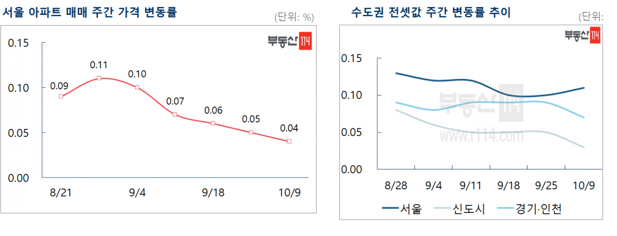 부동산 정보업체 부동산114에 따르면 이번 주 서울 아파트 매매 가격은 2주 전보다 0.04% 올랐다. 오름세는 이어지고 있지만 상승 폭은 8월 말부터 꾸준히 줄고 있다.