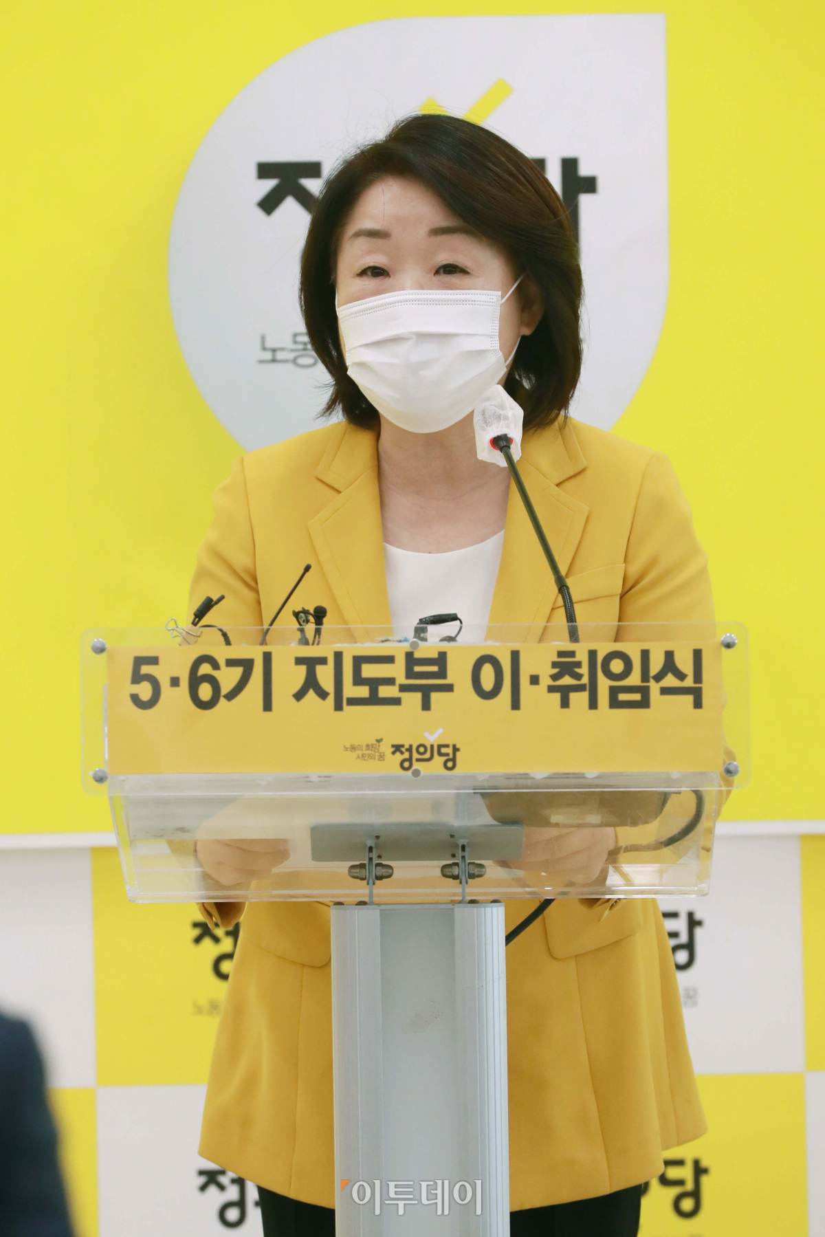 당 대표직을 내려놓는 심상정 정의당 대표가 11일 오전 서울 여의도 국회에서 열린 5·6기 지도부 이·취임식에서 발언을 하고 있다.