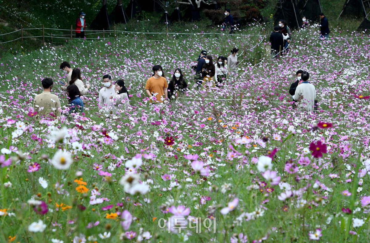 가을이 깊어가는 가운데 11일 서울 송파구 올림픽공원 들꽃마루에서 시민들이 코스모스 길을 거닐며 계절의 정취를 즐기고 있다.