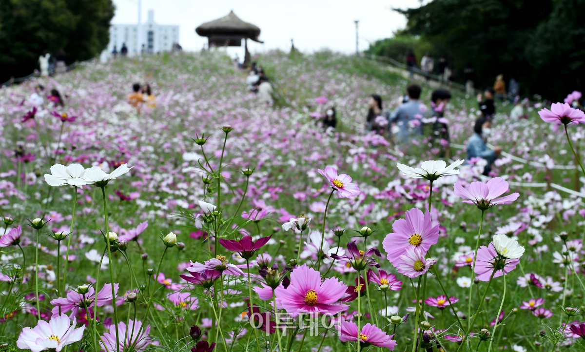 가을이 깊어가는 가운데 11일 서울 송파구 올림픽공원 들꽃마루에서 시민들이 코스모스 길을 거닐며 계절의 정취를 즐기고 있다.