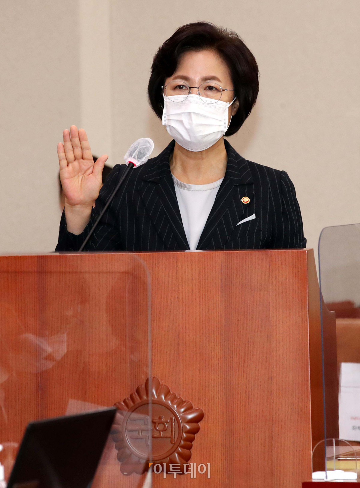 추미애 법무부장관이 12일 국회 법사위 법무부 국정감사에서 증인선서를 하고있다.