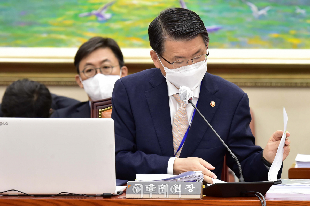 은성수 금융위원장이 12일 서울 여의도 국회 본관 정무위원회 회의실에서 열린 금융위원회 등 2020 국정감사에 출석, 자료를 살피고 있다.