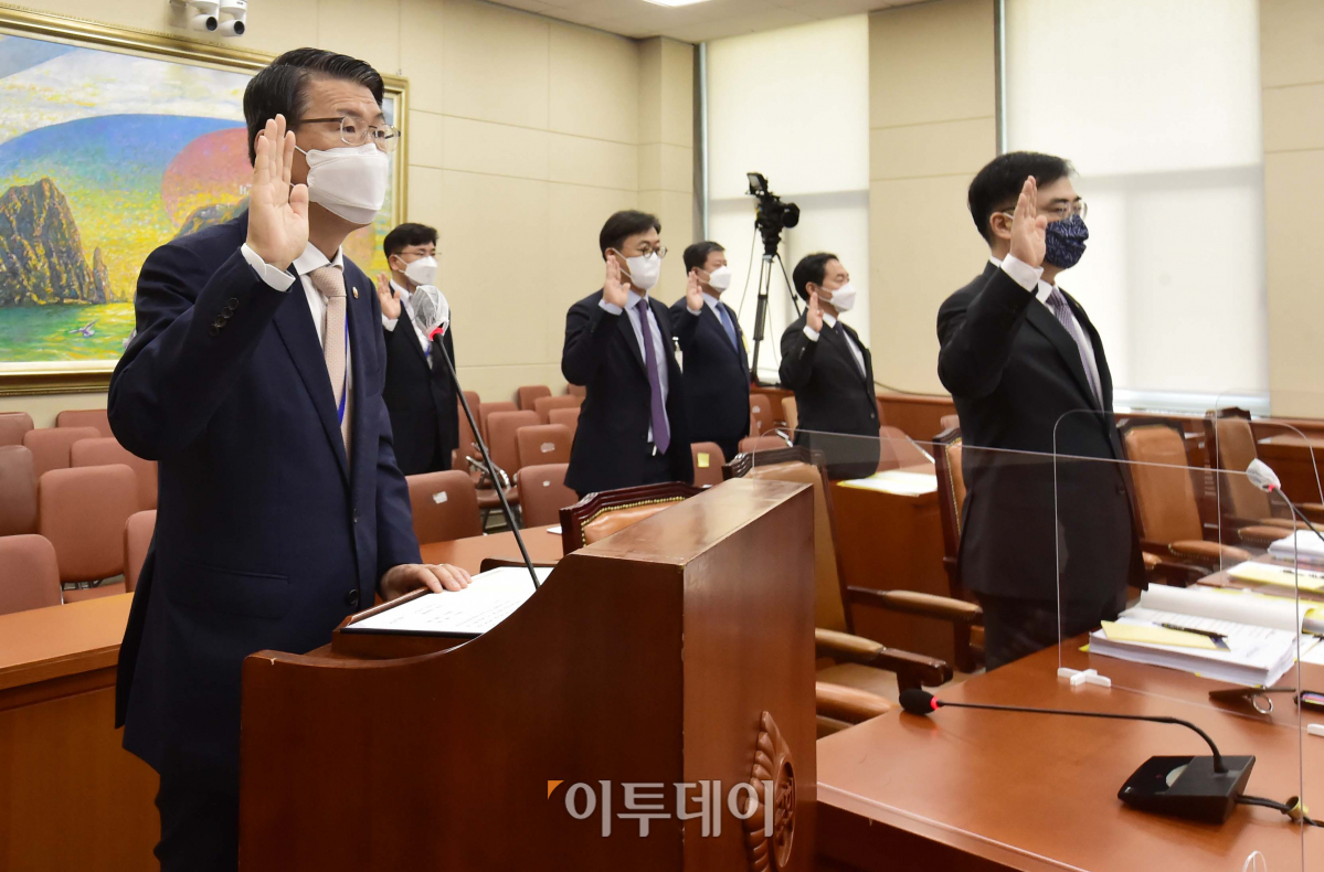 은성수 금융위원장이 12일 서울 여의도 국회 본관 정무위원회 회의실에서 열린 금융위원회 등 2020 국정감사에 출석, 선서를 하고 있다.