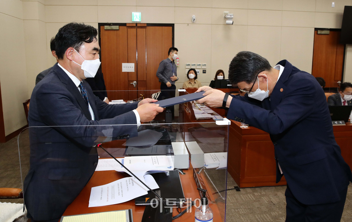 은성수 금융위원장이 12일 오전 국회에서 열린 정무위원회 국정감사에서 선서를 마친뒤 윤관석 위원장에게 선서문을 전달하고 있다.