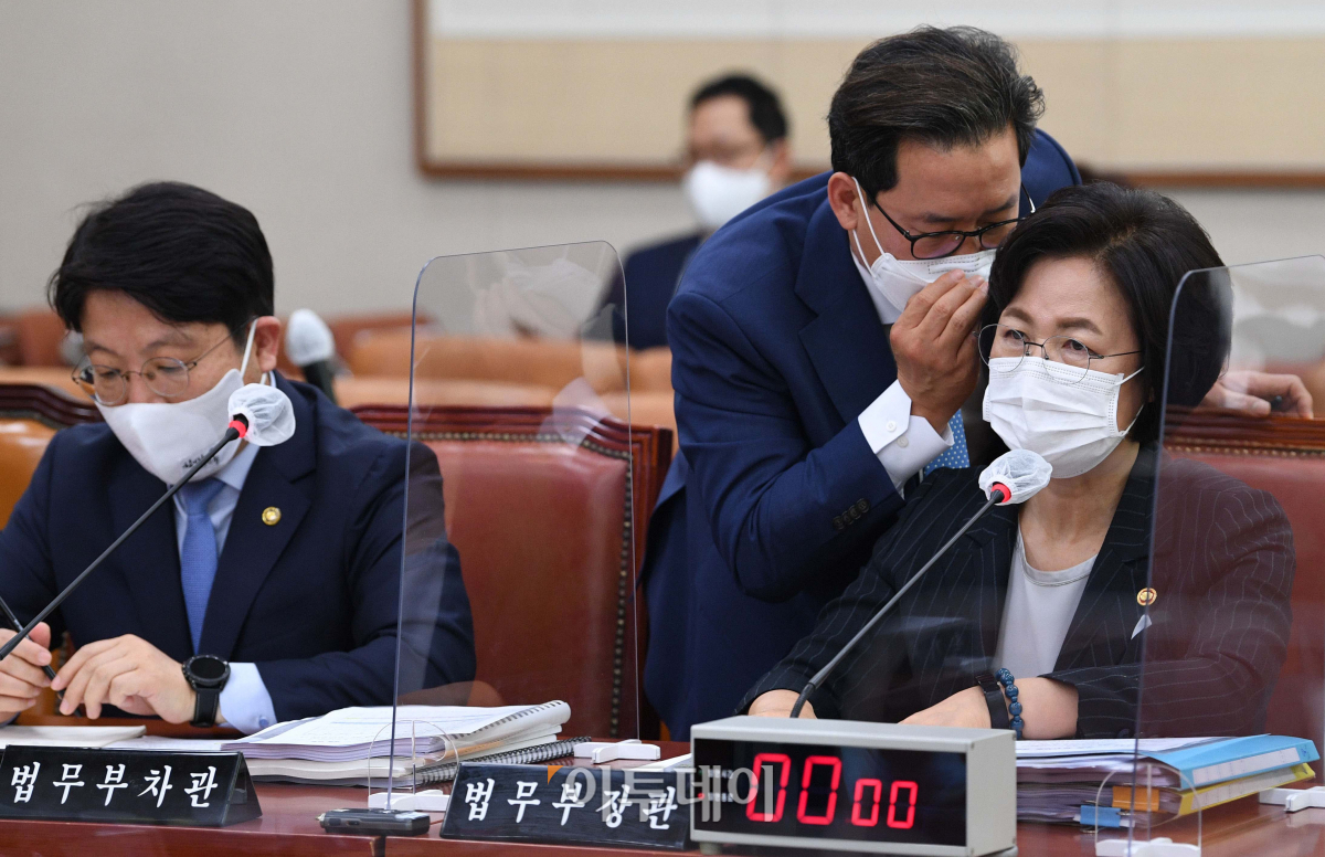 추미애 법무부장관이 12일 국회에서 열린 법제사법위원회의 법무부 등에 대한 국정감사에서 법무부 관계자로부터 귀엣말을 듣고 있다.