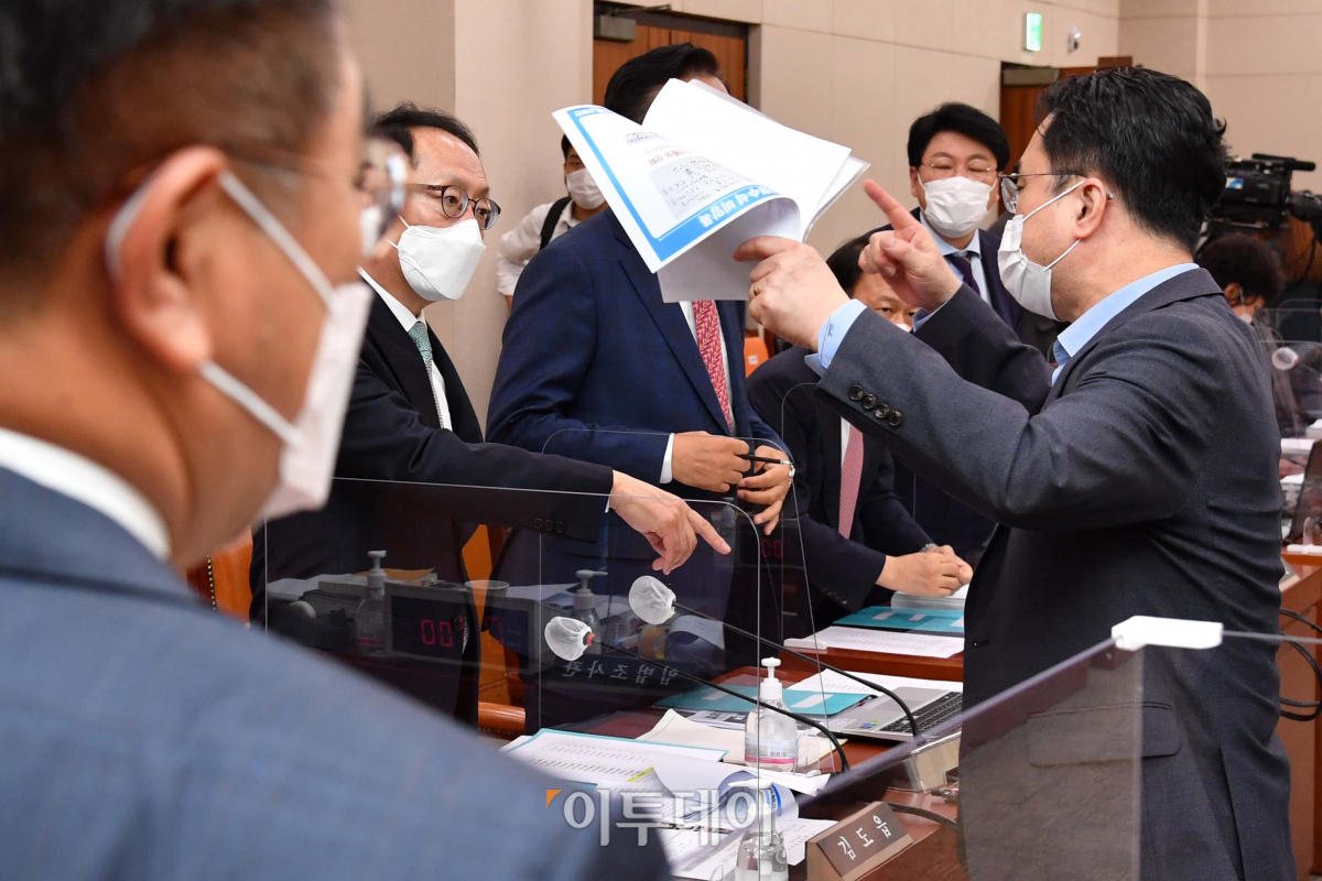 국민의힘 김도읍 간사와 김종민 더불어민주당 의원이 12일 오전 서울 여의도 국회에서 열린 법제사법위원회의 법무부 등에 대한 국정감사에서 정회 후 언쟁을 벌이고 있다.