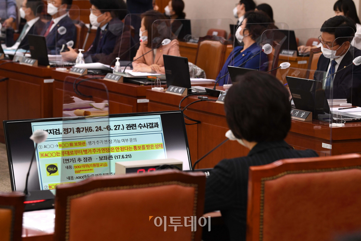 추미애 법무부 장관이 12일 오전 서울 여의도 국회에서 열린 법제사법위원회의 법무부 등에 대한 국정감사에 출석해 아들의 군 복무 시절 휴가와 관련된 질의를 듣고 있다.