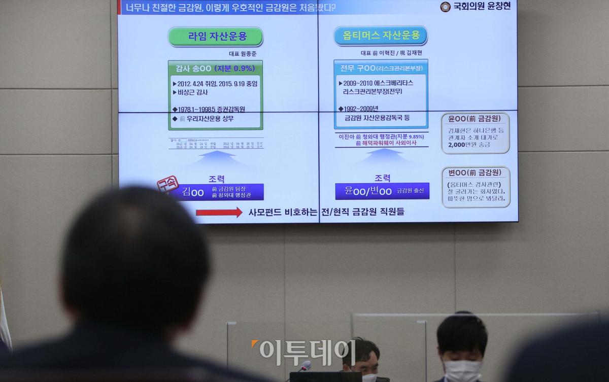 윤창현 국민의힘 의원이 13일 서울 여의도 국회에서 열린 정무위원회의 금융감독원에 대한 국정감사에서 라임 자산운용과 옵티머스 자산운용에 전현직 금감원 직원들이 연루되어 있다며 윤석헌 금감원장에게 질의하고 있다.