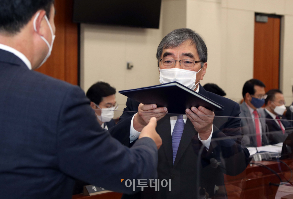 윤석헌 금융감독원장이 13일 오전 서울 여의도 국회에서 열린 정무위원회의 금감원에 대한 국정감사에서 증인선서를 마친 뒤 선서문을 윤관석 위원장에게 전달하고 있다.
