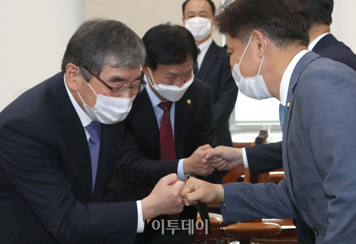 윤석헌 금융감독원장이 13일 오전 서울 여의도 국회에서 열린 정무위원회의 금감원에 대한 국정감사에 참석하며 더불어민주당 김병욱 간사와 인사하고 있다.