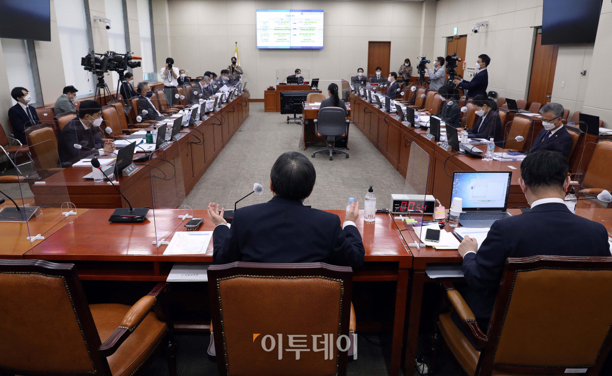 윤석헌 금융감독원장이 13일 서울 여의도 국회에서 열린 정무위원회의 금융감독원에 대한 국정감사에 출석해 의원 질의에 답하고 있다.