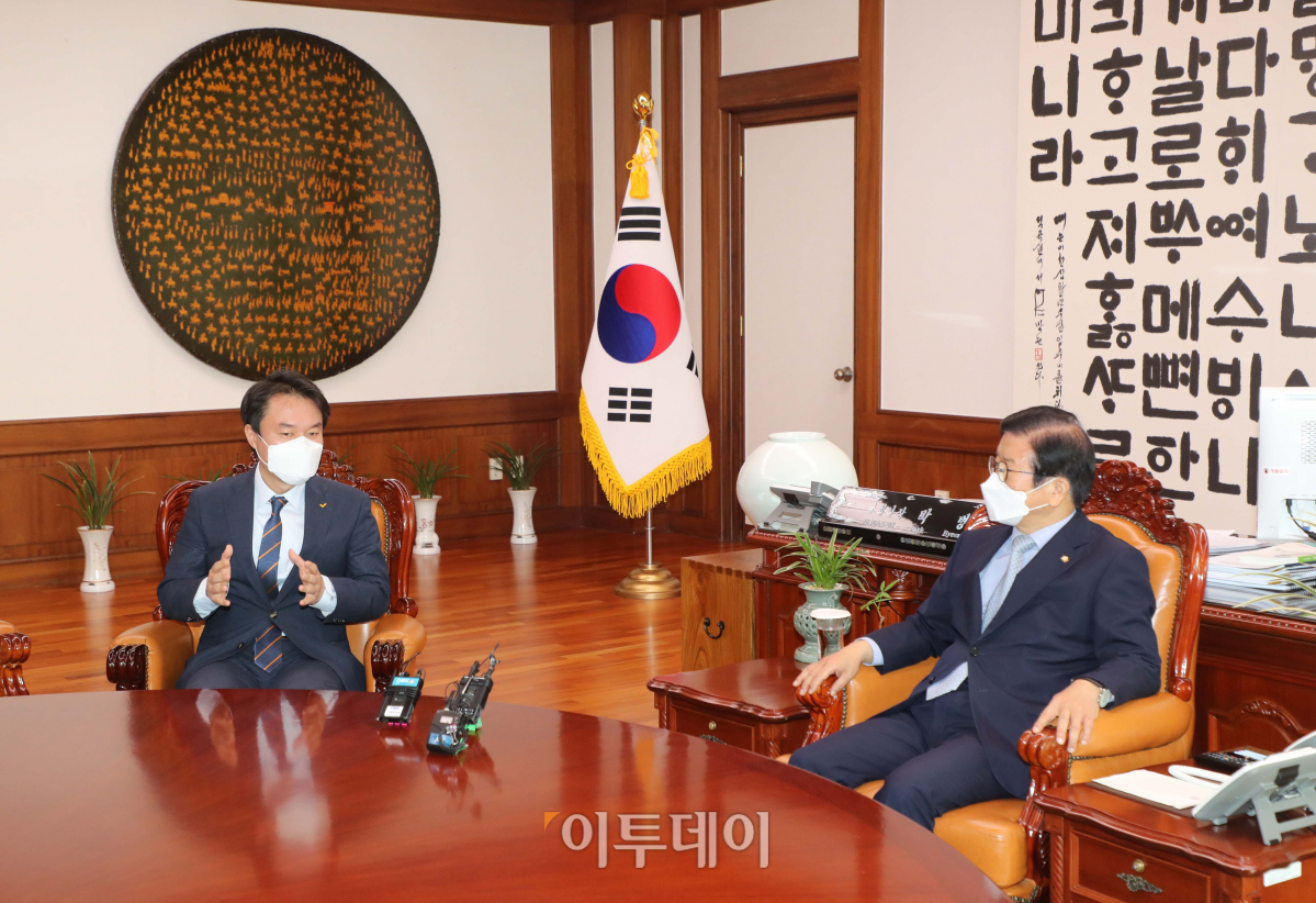 정의당 김종철 신임대표(왼쪽)가 13일 오전 국회 의장실에서 박병석 국회의장과 대화를 나누고 있다.