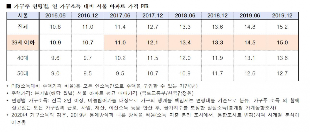 국민의힘 소속 김상훈 국회의원이 국토교통부에서 제출받은 자료에 따르면 지난해 말 기준 가구주가 39세 이하인 2인 이상 도시 가구의 서울 아파트 PIR은 15.0년이다. PIR은 각 가구의 1년 소득을 한 푼도 쓰지 않고 모았을 때 주택 구매에 걸리는 시간을 뜻한다. 주택 가격이 소득보다 빠르게 오르면 PIR이 높아진다.