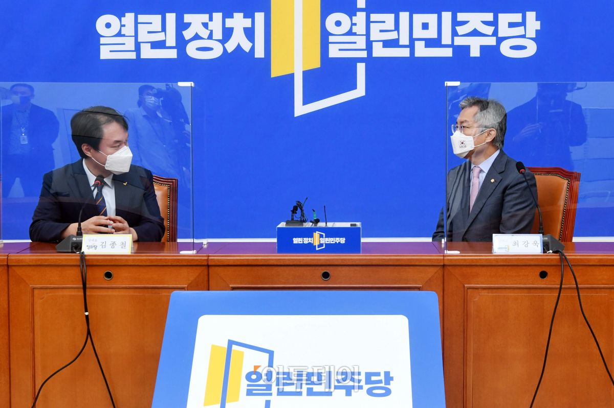 김종철(왼쪽) 정의당 신임 대표가 14일 서울 여의도 국회에서 최강욱 열린민주당 대표를 예방하고 있다.