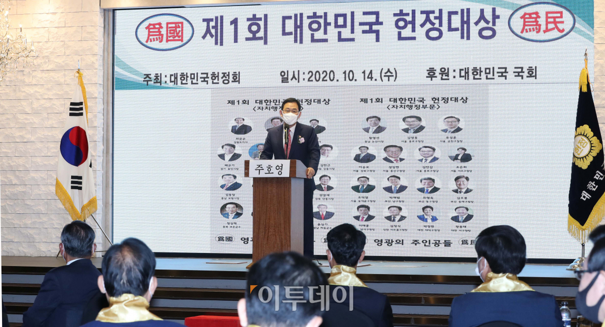 주호영 국민의힘 원내대표가 '1회 대한민국 헌정대상' 자치행정부문 시상식이 열린 14일 오전 서울 여의도 CCMM빌딩에서 축사를 하고 있다.