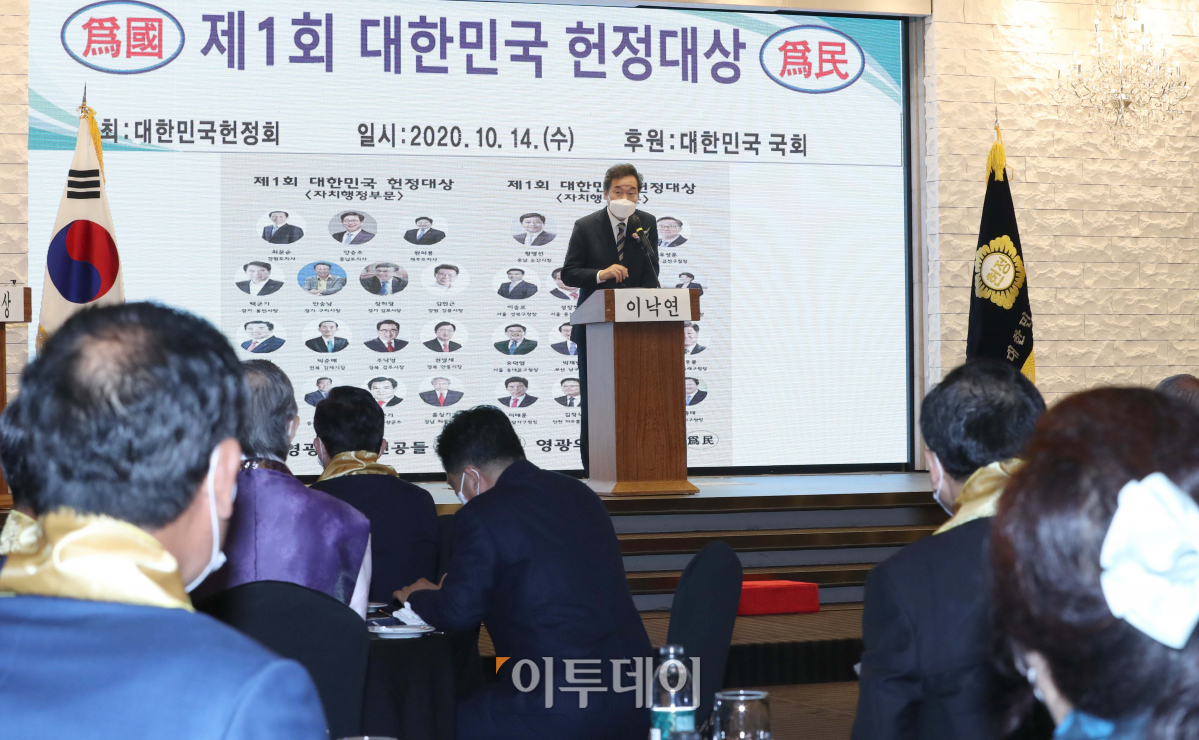 이낙연 더불어민주당 대표가 '1회 대한민국 헌정대상' 자치행정부문 시상식이 열린 14일 오전 서울 여의도 CCMM빌딩에서 축사를 하고 있다.